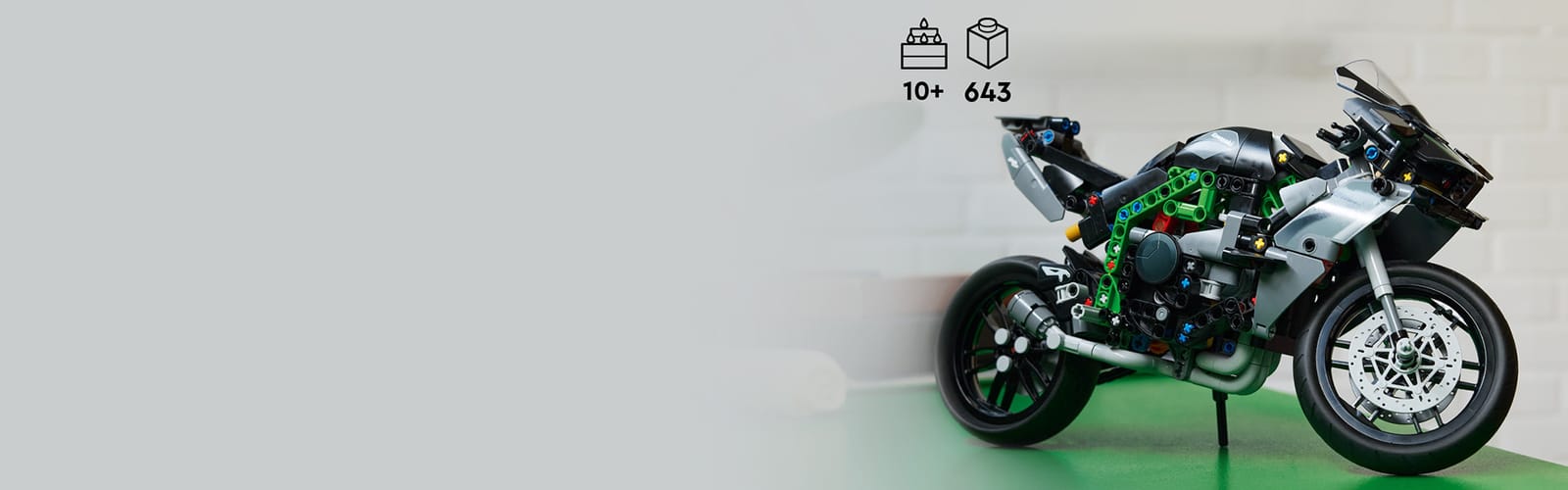This set honors the real Kawasaki Ninja H2R, with steering, suspension, a 2-speed gearbox, 4-piston engine and supercharger.